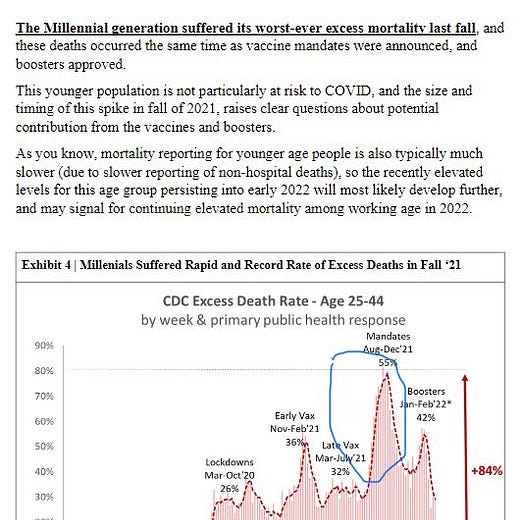 A biztosításokat a társaságok jellemzően az alkalmazottaikra életbiztosításokat kötő vállalatoknak adják el, amely a haláleset bekövetkeztekor ellemzően kis összegű haláleseti kifizetést ad, és a biztosításokat a biztosítók 1-3 évente újraárazzák, így rövid lejáratúnak nevezik őket. Ezért látunk most először veszteségeket az életbiztosítóknál. A halálozások demográfiája alapján jellemzően a munkaképes korú emberek halnak meg. A CDC-adatokkal ellentétben ez a demográfiai csoport nem hajlamos öngyilkosságot elkövetni vagy fentanil/opioid problémával küzdeni. Szóval ezek az érvek nem relevánsak. A sokkal magasabb összegű egyéni életbiztosításokat nem árazzák át olyan gyakran, ha egyáltalán megteszik. Ez egy olyan időzített bomba, amely meg fog jelenni a biztosítók eredményeiben, ha ez a nemzeti tragédia folytatódik.